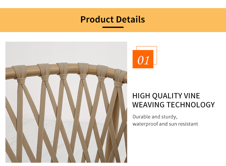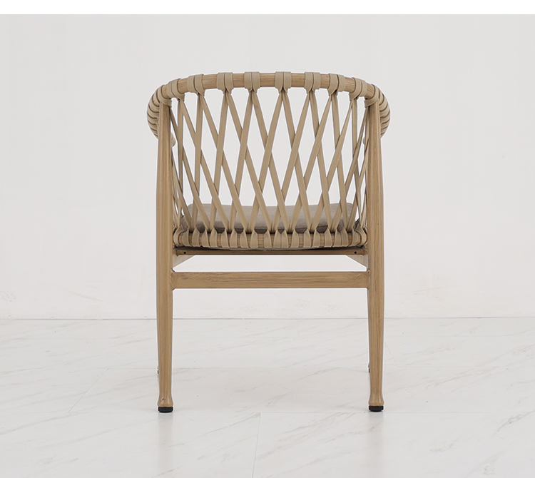 This outdoor aluminum alloy chair combines modern design with natural elements, delivering unprecedented comfort and style. Its aluminum alloy frame provides sturdy support, while the brushed wood grain finish is both modern and mimics natural wood, showcasing a delicate texture and warm visual effect. The seat, backrest, and armrests feature exquisitely braided rope details, ensuring both comfort and durability while exuding a natural, handcrafted artistic feel. Whether placed in a garden, on a balcony, or on an outdoor cafe or bar terrace, this chair blends seamlessly with its surroundings, enhancing the quality and atmosphere of the space.