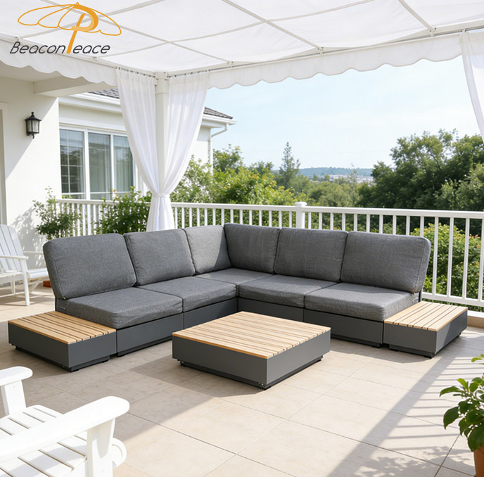 This BP8540 outdoor sectional sofa set is crafted from a sturdy aluminum frame and durable wood-plastic composite (WPC) accents. The aluminum frame offers exceptional rust resistance, lightweight stability, and long-lasting durability, while the WPC side tables and coffee table top mimic natural wood grain with superior weather and water resistance. The thick, water-resistant cushions provide plush comfort, making this modular set ideal for patios, balconies, or gardens, blending modern minimalist design with versatile outdoor functionality.